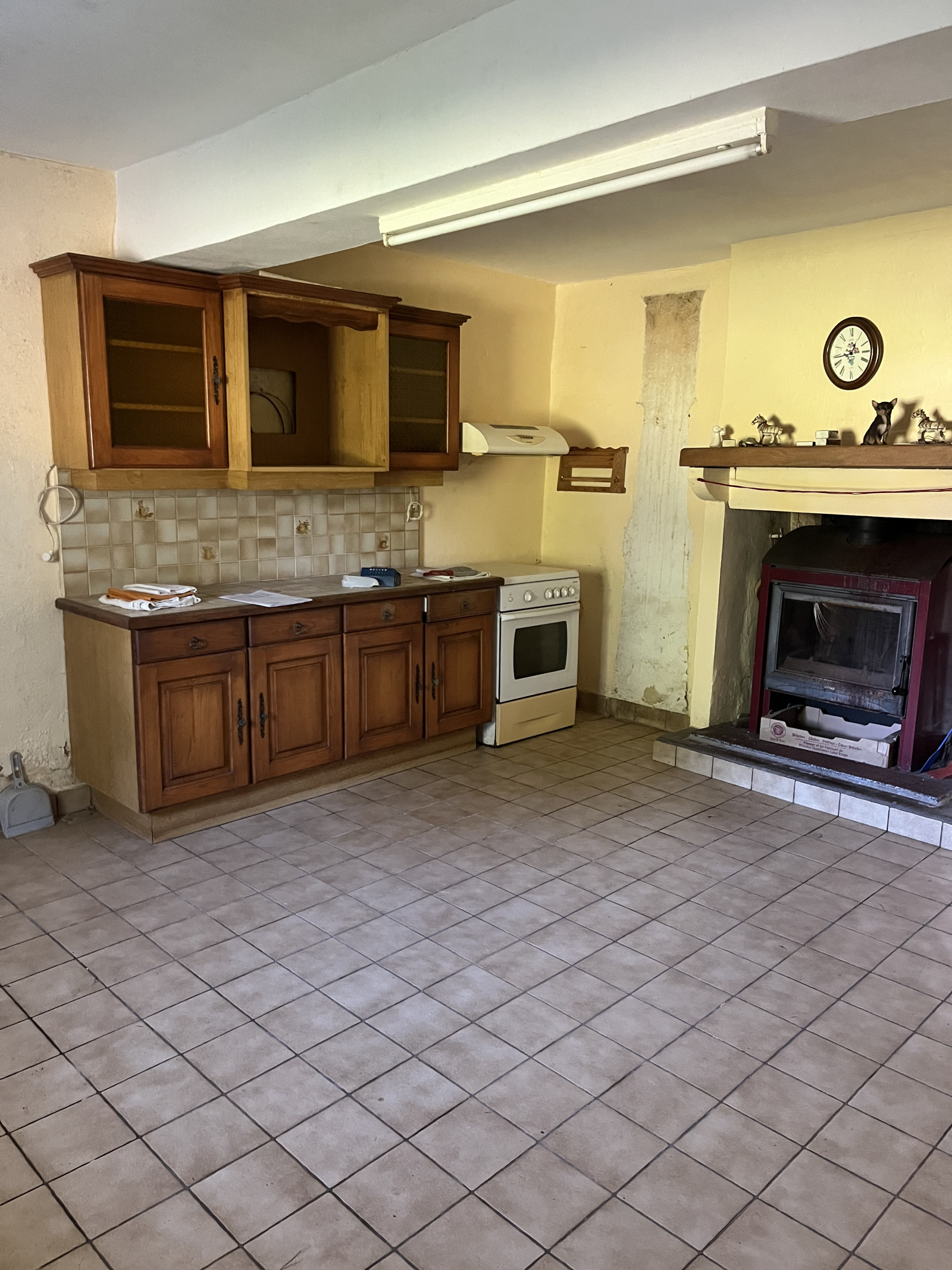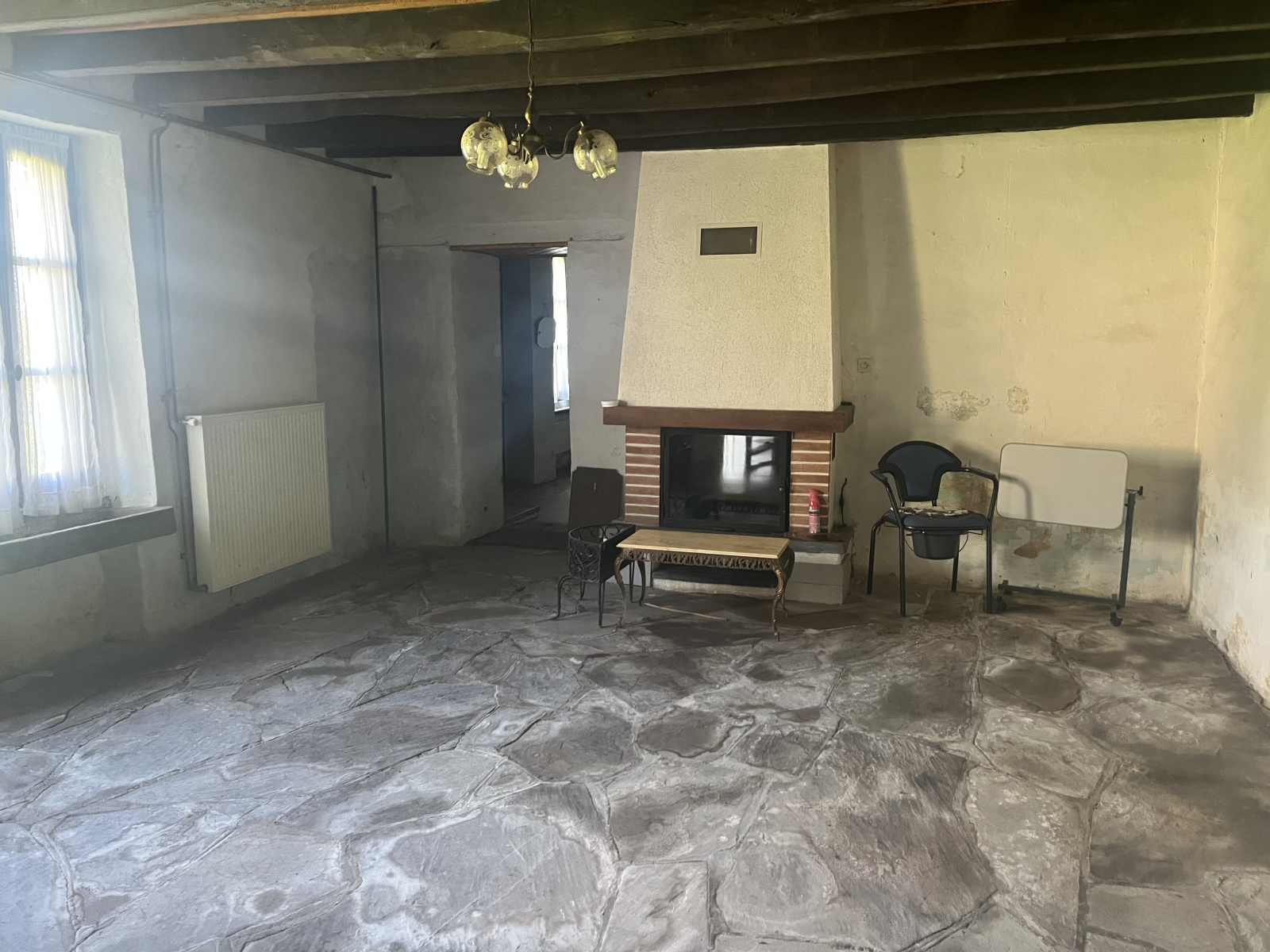 La maison offre actuellement deux grandes pièces, une cuisine, une salle de bain, un WC et un cellier.
