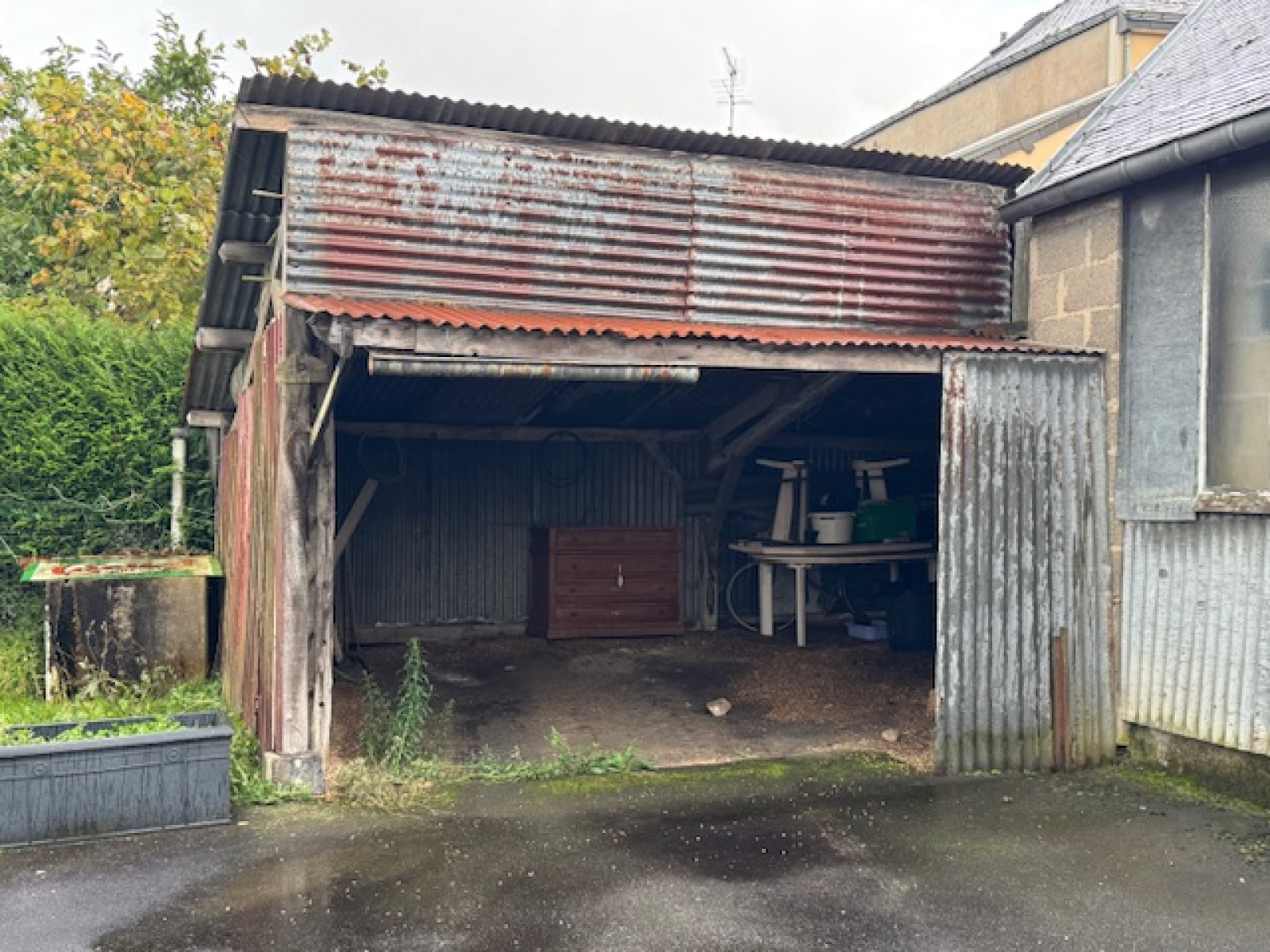 A l'extérieur une petite dépendance servant d'abri pour un véhicule.