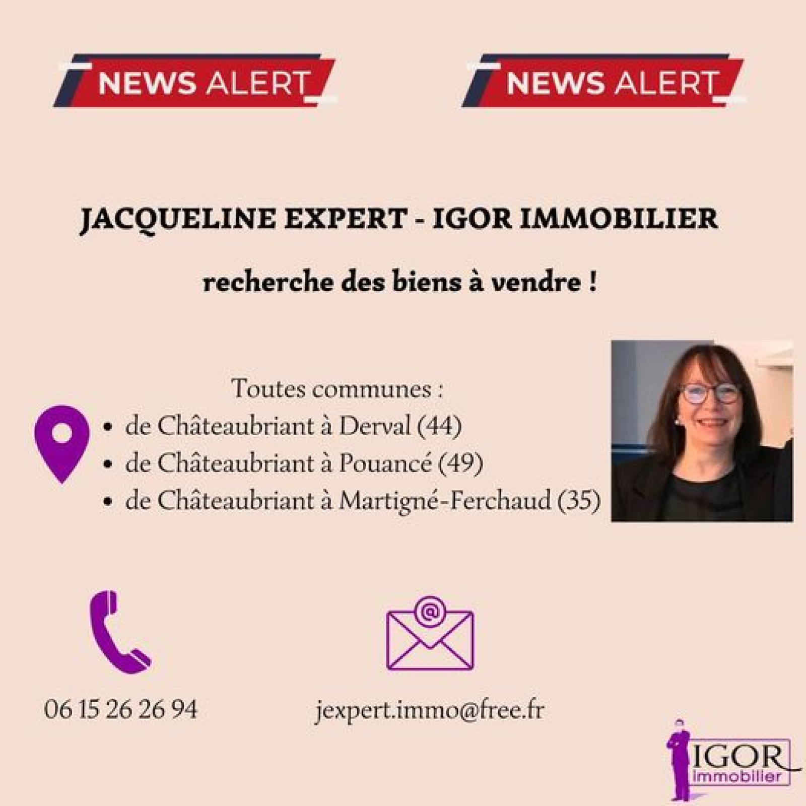 Pour VISITES et RENSEIGNEMENTS COMPLEMENTAIRES, contactez Jacqueline EXPERT AU 06 15 26 26 94 ou 02 40 55 39 68